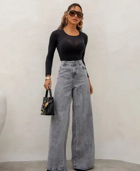 Calça Jeans Wide Leg Feminina Relaxed Cinza