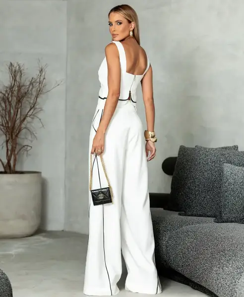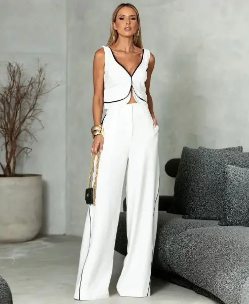 Conjunto Toulon Off-White com Preto (1 cropped + 1 calça)