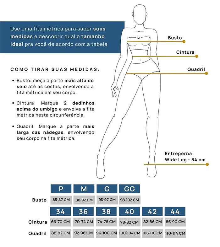 Conforto e caimento: Peças com um ótimo corte e caimento, mas nunca ser excessivamente justas ou apertadas. Modelagens fluidas, como a pantalona e a wide leg são ideais.