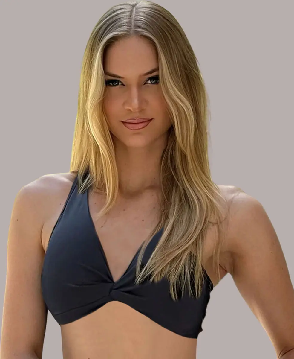 Top fitness estilo camiseta, com bojo removível, decote em V com detalhe torcido e recorte nadador.